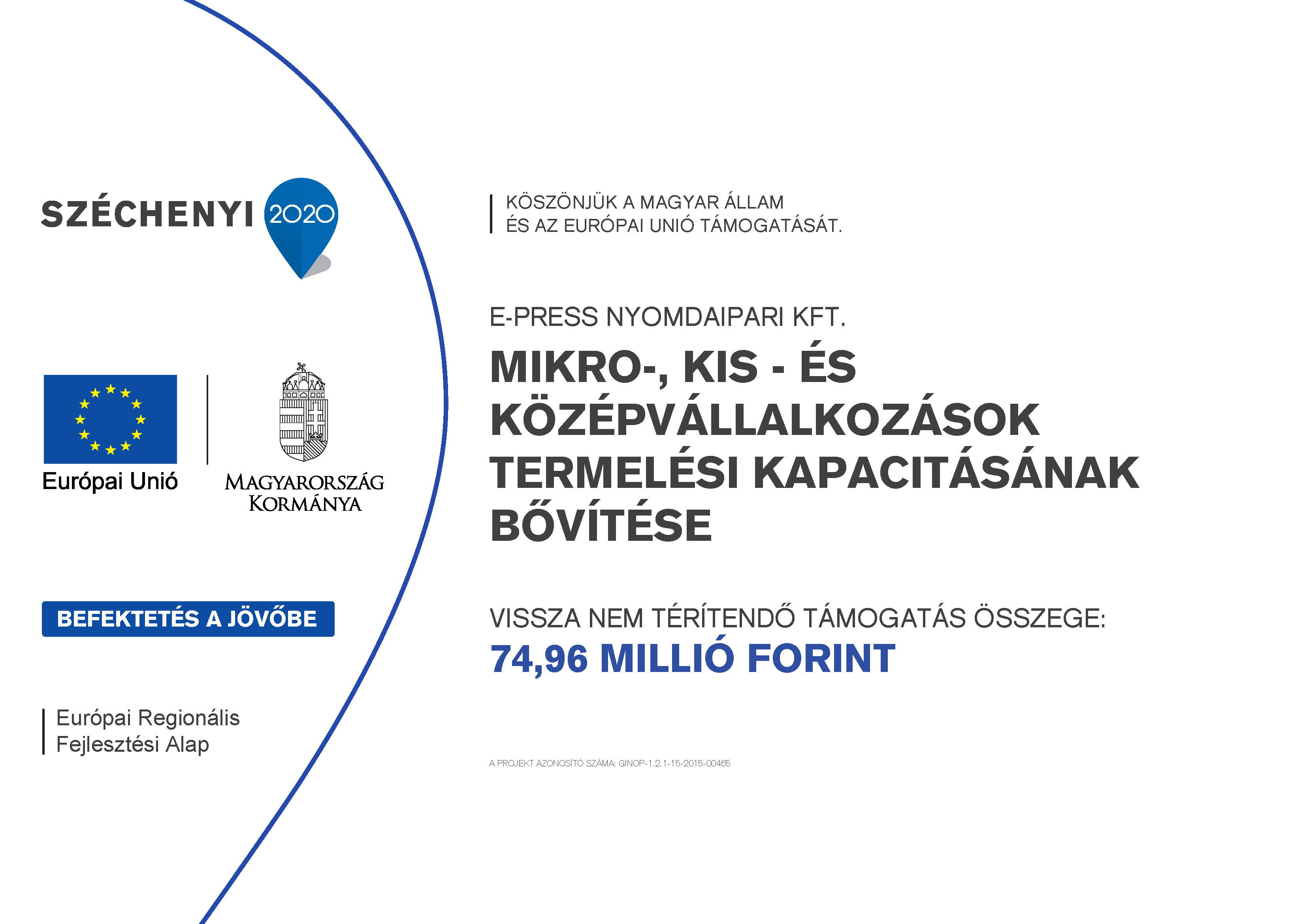 GINOP-1.2.2-16-2017-01268 - Mikro-, kis - és középvállalkozások termelési kapacitásának bővítése (Kapacitásbővítő beruházás az E-Press Nyomda Nyomdaipari Szolgáltató Kft-nél); vissza nem térítendő támogatás összege: 37.688.465 Ft